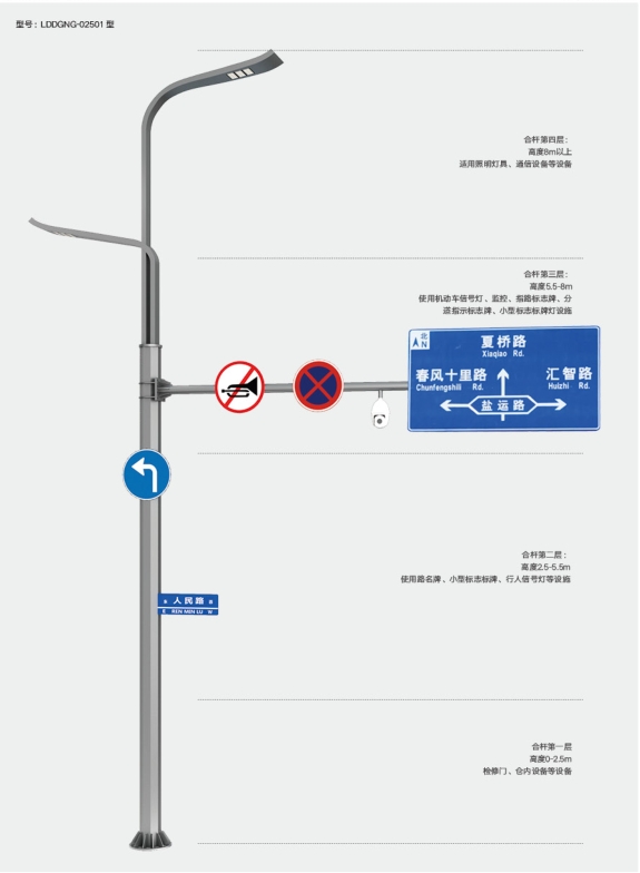 “多桿合一”是在綜合考慮各類桿件布設要求的前提下,各類桿件應按照“能合則合”的原則進行合桿。環(huán)境監(jiān)測、揚塵監(jiān)測、通信設備以及公廁指示牌等設施應利用綜合桿設置。對主要道路進行了“多桿合一”的整治工作。統(tǒng)一的顏色,采用高強度鋼材或高強度鋁合金型材并實現(xiàn)分層設計。將通信桿、信號桿、路牌桿、電線桿……統(tǒng)一收進“升級版”路燈桿。使城市道路應優(yōu)化整體設計,小型化、減量化